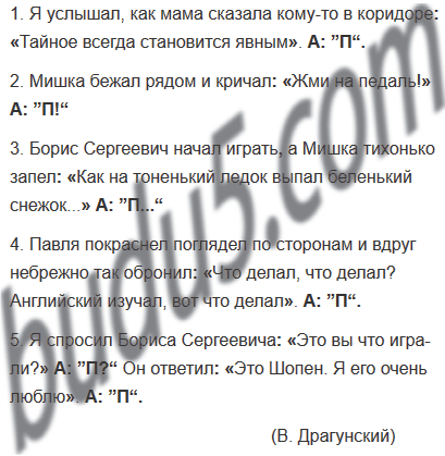 1. Я услышал, как мама сказала кому-то в коридоре (Тайное всегда становится явным.) 2. Мишка бежал рядом и кричал (Жми на педаль!) 3. Борис Сергеевич начал играть а Мишка тихонько запел (Как на тоненький ледок выпал беленький снежок...) 4. Павля покраснел поглядел по сторонам и вдруг небрежно так обронил (Что делал, что делал? Английский изучал, вот что делал.) 5. Я спросил Бориса Сергеевича (Это вы что играли?) Он ответил (Это Шопен. Я его очень люблю.)