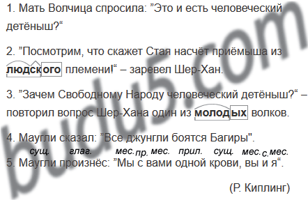 1. ”Это и есть человеческий детёныш?“ – спросила Мать Волчица. 2. Шер-Хан заревел: ”Посмотрим, что скажет Стая насчёт приёмыша из людского2 племени!“ 3. Один из молодых2 волков повторил вопрос Шер-Хана: ”Зачем Свободному Народу человеческий детёныш?“ 4. ”Все джунгли боятся Багиры“, – сказал Маугли. 5. ”Мы с вами одной крови, вы и я“, – произнёс Маугли.