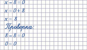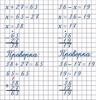 | х + 27 = 65 х = 65 - 27 х = 38 Проверка 38 + 27 = 65 65 = 65 | 36 - х = 19 х = 36 - 19 х = 17 Проверка 36 - 17 = 19 19 = 19 | х - 8 = 0 х = 8 + 0 х = 8 Проверка 8 - 8 = 0 0 = 0 |