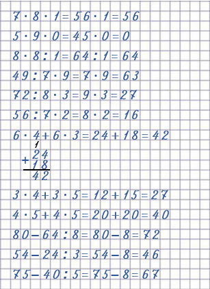 | 56 : 7 • 2 = 16 1) 56 : 7 = 8 2) 8 • 2 = 16 | 75 - 40 : 5 = 67 1) 40 : 5 = 8 2) 75 - 8 = 67 |