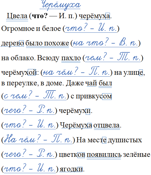 Цвела (что? — И. п.) черёмуха. Огромное и белое ( ) дерево было похоже ( ) на облако. Всюду пахло ( ) черёмухой: ( ) на улице, в переулке, в доме. Даже чай был ( ) с привкусом ( ) черёмухи. ( ) Черёмуха отцвела. ( ) На месте душистых ( ) цветков появились зелёные ( ) ягодки.