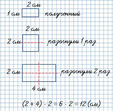 2. Лист бумаги прямоугольной формы сложи вдвое, а потом ещё раз вдвое, как показано на рисунке. Измерь стороны полученного прямоугольника и найди его периметр. Определи без измерений периметр развёрнутого листа.