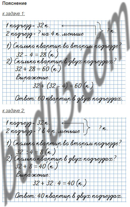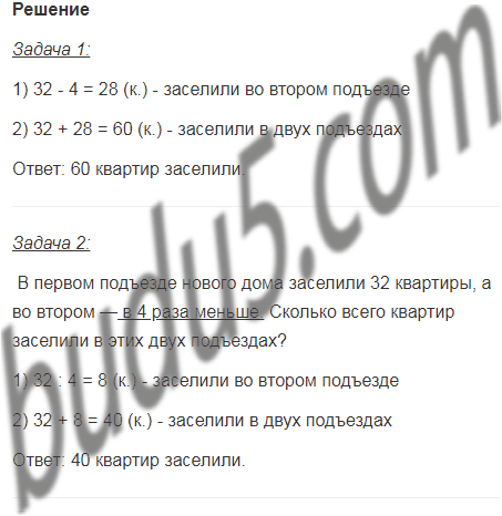 21. В первом подъезде нового дома заселили 32 квартиры, а во втором — на 4 квартиры мень­ше. Сколько всего квартир заселили в этих двух подъездах?