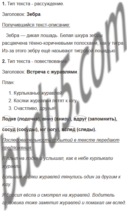 2.Я плыл на лодке вниз по реке и вдруг услышал, как в небе кто-то начал осторожно переливать воду из звонкого стеклянного сосуда в другой такой же сосуд. Вода булькала, позванивала, журчала. Это курлыкали журавли.