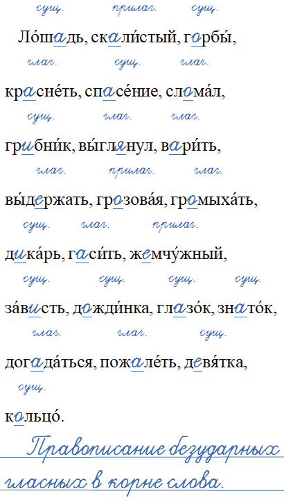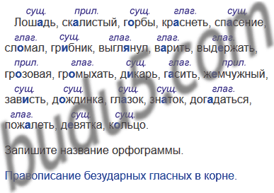 Лош_дь, ск_листый, г_рбы, кр_снеть, сп_сение, сл_мал, гр_бник, выгл_нул, в_рить, выд_ржать, гр_зовая, гр_мыхать, д_карь, г_сить, ж_мчужный, зав_сть, д_ждинка, гл_зок, зн_ток, дог_даться, пож_леть, д_вятка, к_льцо.