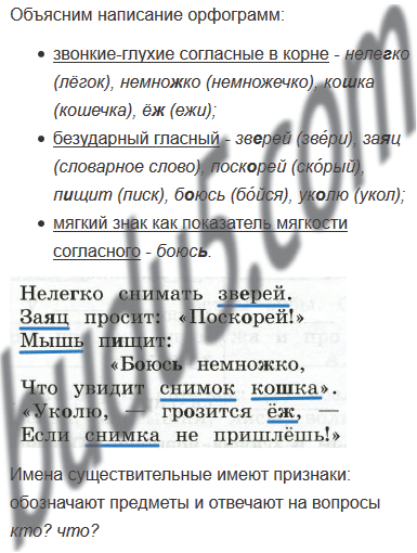 Объясним написание слов: нелегко (легонько); звере́й (зве́рь); заяц (словарное слово); поскоре́й (ско́ро); пищи́т (пи́ск); бою́сь (бо́йся; ь для обозначения мягкости согласного); кошка (кошечка); уколю́ (ко́лет); грози́тся (гро́зный); ёж (ёжик).