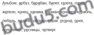 Альбом, арбуз, барабан, билет, газета, город, железо, конец, канава, карман, концерт, корабль, лебедь, ладонь, облако, овраг, огород, орех, полотенце, ресницы, четверг.