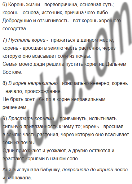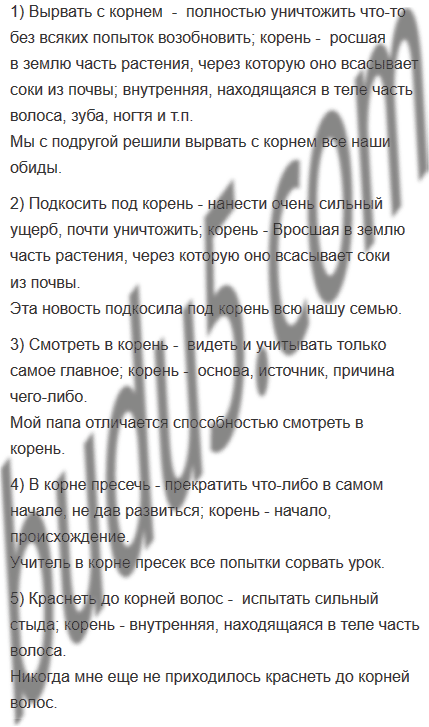 1. Объясните смысл фразеологизмов и определите, в каком значении употреблено слово корень в каждом из них. Составьте предложения с этими фразеологизмами.