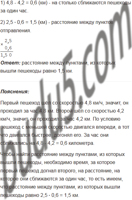 Из двух пунктов в одном направлении одновременно вышли два пешехода. Пешеход, который двигался со скоростью 4,8 км/ч, догнал пешехода, который двигался со скоростью 4,2 км/ч, через 2,5 ч после начала движения. Найдите расстояние между пунктами, из которых вышли пешеходы.