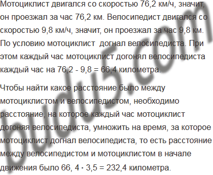 Из двух пунктов в одном направлении одновременно выехали велосипедист и мотоциклист. Мотоциклист двигался со скоростью 76,2 км/ч и догнал велосипедиста, который двигался со скоростью 9,8 км/ч, через 3,5 ч после начала движения. Найдите, какое расстояние было между велосипедистом и мотоциклистом в начале движения.