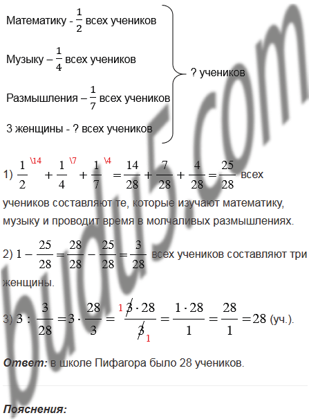 Рассказывают, что на вопрос, сколько учеников в его школе, великий древнегреческий ученый Пифагор ответил: "Половина изучает математику, четверть - музыку, седьмая часть проводит время в молчаливых размышлениях, кроме того, есть еще три женщины." Сколько учеников было в школе Пифагора?