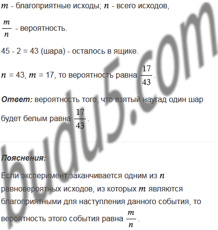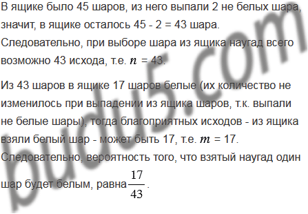 В ящике было 45 шаров, из которых 17 - белых. Потеряли два не белых шара. Какова вероятность того, что взятый наугад один шар будет белым?