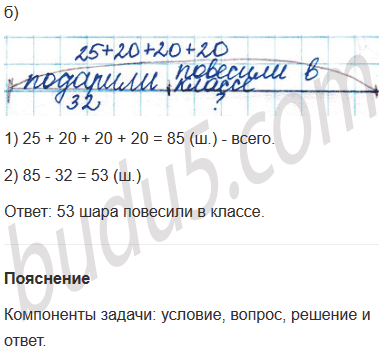 б) К празднику купили 25 красных шаров и по 20 синих, зелёных и жёлтых. Ученикам подарили 32 шара, а остальные повесили в классе. Сколько шаров повесили в классе?