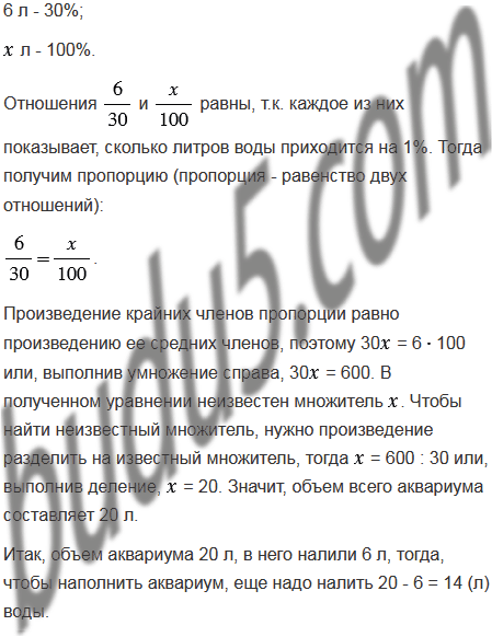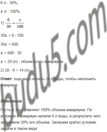 В аквариум налили 6 л воды, в результате чего заполнили 30% его объема. Сколько еще надо налить воды, чтобы наполнить аквариум?