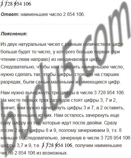 В записи числа 3 728 954 106 зачеркните три цифры так, чтобы оставшиеся цифры в том же порядке составили наименьшее из возможных чисел.