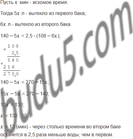 В одном баке было 140 л воды, а в другом - 108 л. В баках одновременно открыли краны. Из первого бака ежеминутно вытекает 5 л воды, а из второго - 6 л. Через сколько минут во втором баке останется в 2,5 раза меньше воды, чем в первом?
