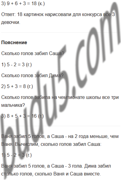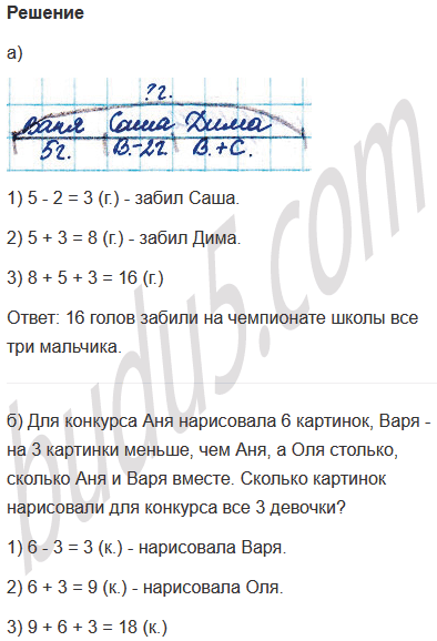 а) На чемпионате школы по футболу Ваня забил 5 голов, Саша - на 2 гола меньше, чем Ваня, а Дима забил столько голов, сколько Ваня и Саша вместе. Сколько голов забили на чемпионате школы все три мальчика?