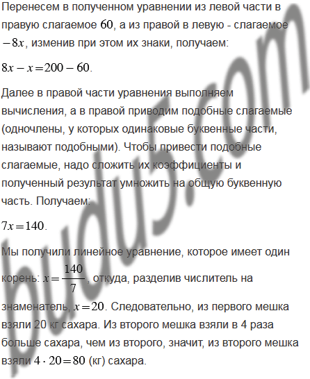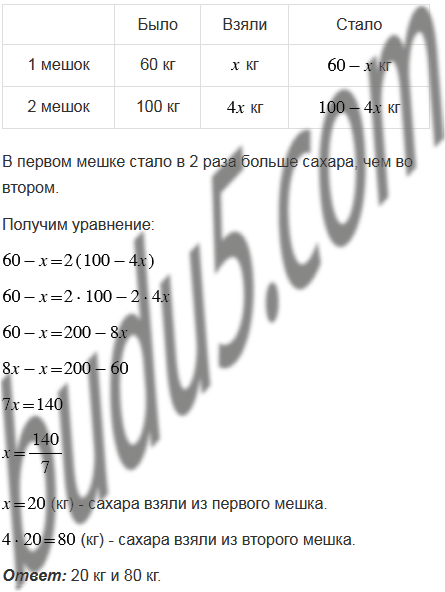 В одном мешке было 60 кг сахара, а в другом - 100 кг. Когда из второго мешка взяли в 4 раза больше сахара, чем из первого, то в первом осталось в 2 раза больше сахара, чем во втором. Сколько килограммов сахара взяли из каждого мешка?