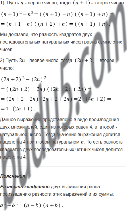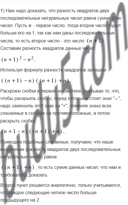 1) разность квадратов двух последовательных натуральных чисел равна сумме этих чисел;