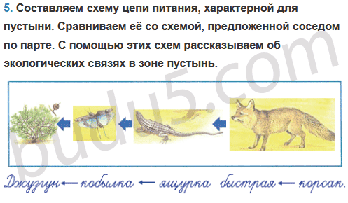 5. Составь схему цепи питания, характерной для пустыни. Сравни её со схемой, предложенной соседом по парте. С помощью этих схем расскажи об экологических связях в зоне пустынь.