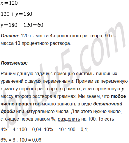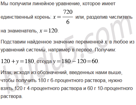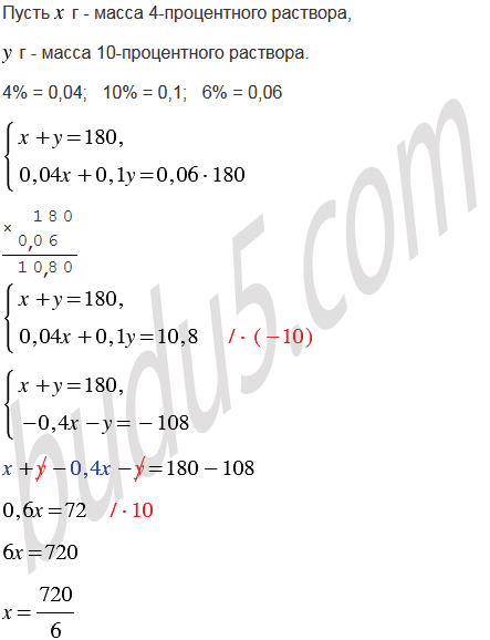 Сколько надо взять 4-процентного и сколько 10-процентного раствора соли, чтобы получить 180 г 6-процентного раствора?