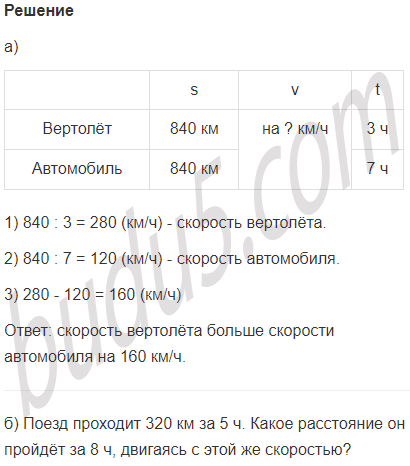 а) Вертолёт пролетает 840 км за 3 ч, а автомобиль проходит это же расстояние за 7 ч. Чья скорость больше и на сколько?