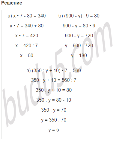 а) х • 7 - 80 = 340 б) (900 - у) : 9 = 80