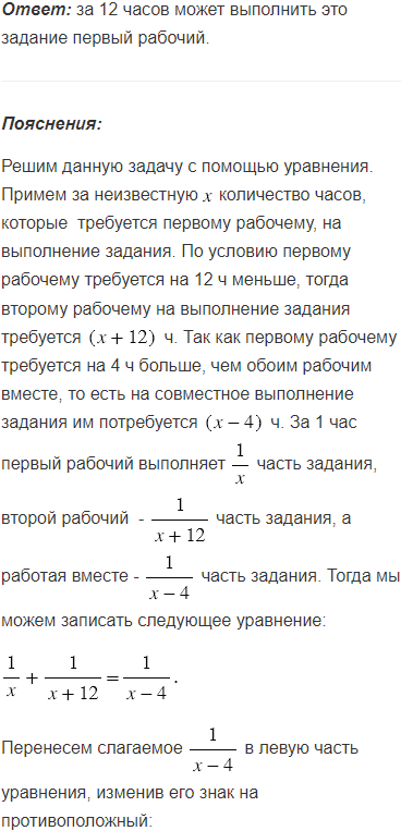 Чтобы выполнить некоторое производственное задание, одному рабочему требуется на 12 ч меньше, чем другому, и на 4 ч больше, чем обоим рабочим для совместного выполнения задания. За сколько часов может выполнить это задание первый рабочий?