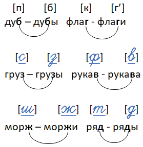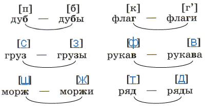 Парные по звонкости-глухости буквы: б-п, г-к, д-т, ж-ш, з-с.