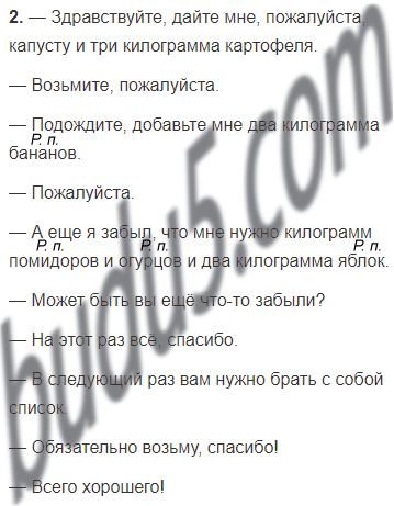 2. - Здравствуйте. Взвесьте мне, пожалуйста, два килограмма апельсинов, килограмм груш и килограмм яблок.