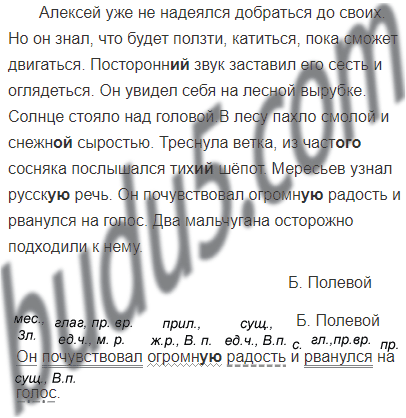 Алексей уже не надеялся добраться до своих. Но он знал,что будет ползти, катиться, пока сможет двигаться. Посторонн.. звук заставил его сесть и оглядеться. Он увидел себя на лесной вырубке. Солнце стояло над головой.В лесу пахло смолой и снежн.. сыростью. Треснула ветка, из част.. сосняка послышался тих.. шёпот. Мересьев узнал русск.. речь. Он почувствовал огромн.. радость и рванулся на голос. Два мальчугана осторожно подходили к нему.