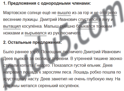 Было раннее утро. Мартовское солнце ещё не вышло из-за гор и не отогрело весенние лужицы. Помощник лесничего Дмитрий Иванович Деев выехал за околицу деревни. В утренней тишине звонко стучали копыта Гнедого. Показался густой ельник. Деев направил лошадь к зарослям леса. Лошадь робко пошла по хрустящему насту. Деев заметил не очень глубокую яму. На дне ямы метался серенький косулёнок. Дмитрий Иванович спустился в яму и вытащил косулёнка. Малыш смешно брыкался тонкими ножками и вырвался из рук лесничего.
